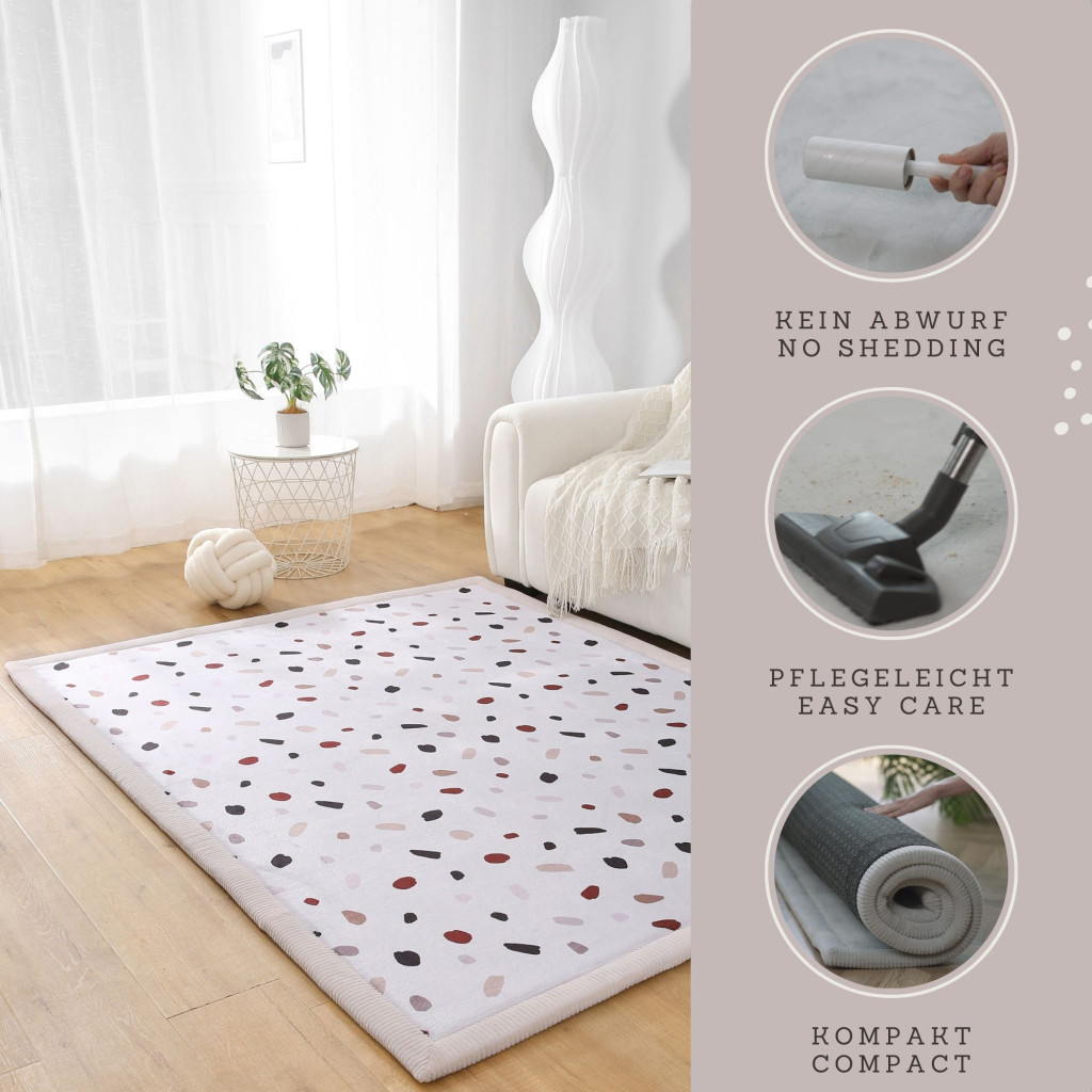 A Konfetti minta apró, finoman elosztott formái vidám hangulatot teremtenek anélkül, hogy túlzsúfolttá tennék a teret. A visszafogott színvilág játékosságot visz a szobába, miközben megőrzi a nyugodt, harmonikus összhatást. A dizájn könnyedén illeszkedik modern, skandináv vagy letisztult enteriőrökbe is, így a szőnyeg nemcsak praktikus játszófelület, hanem stílusos kiegészítője az otthonnak. Gyerekszobában és közös terekben egyaránt jól működik.