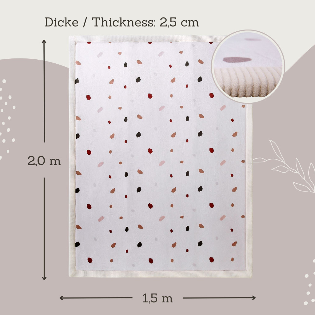 A 150 × 200 cm-es méret bőséges teret ad a kúszáshoz, mászáshoz, építéshez, meséléshez vagy pihenéshez. A szőnyeg kijelöli a játék helyét, mégis harmonikusan illeszkedik az otthon egészébe.