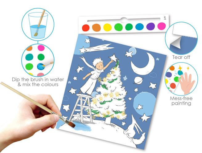 A könyv 15 csodaszép, A kis herceg meséje által inspirált oldalt tartalmaz, amelyeken sivatagok, rózsák, rókák és aranyló naplementék elevenednek meg. A lapokon található beépített festékpaletták (összesen 180 színmező) vízzel aktiválhatók, így a festés egyszerű és rendezett élmény.