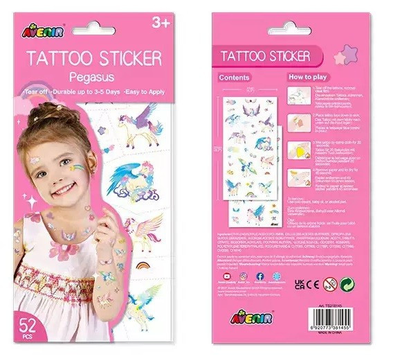 52 db-os lemosható tetoválás csomag az Avenir Kids márkától unikornis témakörben. A tetoválásokat vízzel és szappannal könnyű eltávolítani.