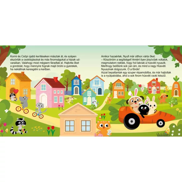 Csöpi, a kíváncsi kutyus és Kormi, a találékony cica ezúttal a húsvét varázslatos világába kalauzolja el a gyerekeket. Egy félreértésből induló kaland során találkoznak a húsvéti nyuszival, segítenek neki a csokitojások „elrejtésében”, és közben megtanulják, mit jelent az együttműködés, a figyelmesség és az ünnep igazi öröme.