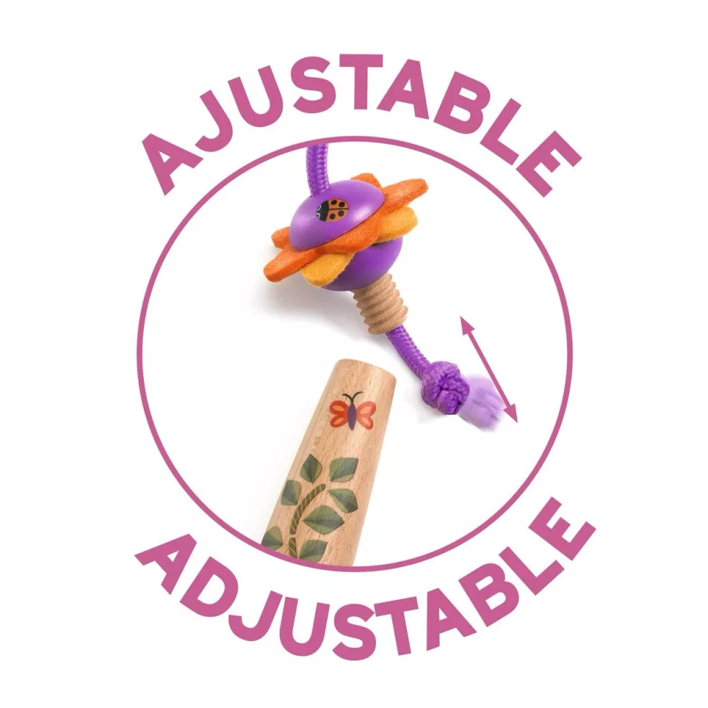 A Florita ugrálókötél igazán kedves és minőségi mozgásfejlesztő játék, amelynek szépen díszített, virág formájú fogantyúi FSC tanúsítvánnyal rendelkező fából készültek. A kötél hossza egyszerűen a gyermek magasságához igazítható: csak csavard le a virág alakú fogantyút, köss új csomót, majd rögzítsd újra.