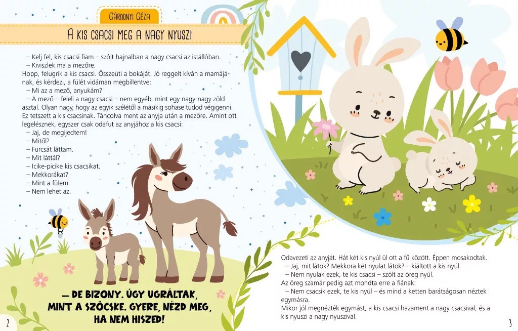 A könyv nemcsak meséket, hanem 10 kedves húsvéti locsolóverset is tartalmaz, amelyek segítenek a gyerekeknek játékosan készülni az ünnepre. A rövid, vidám történetek tökéletesek közös esti meséléshez, és könnyen megszerettethetik az olvasást a kisebbekkel is.