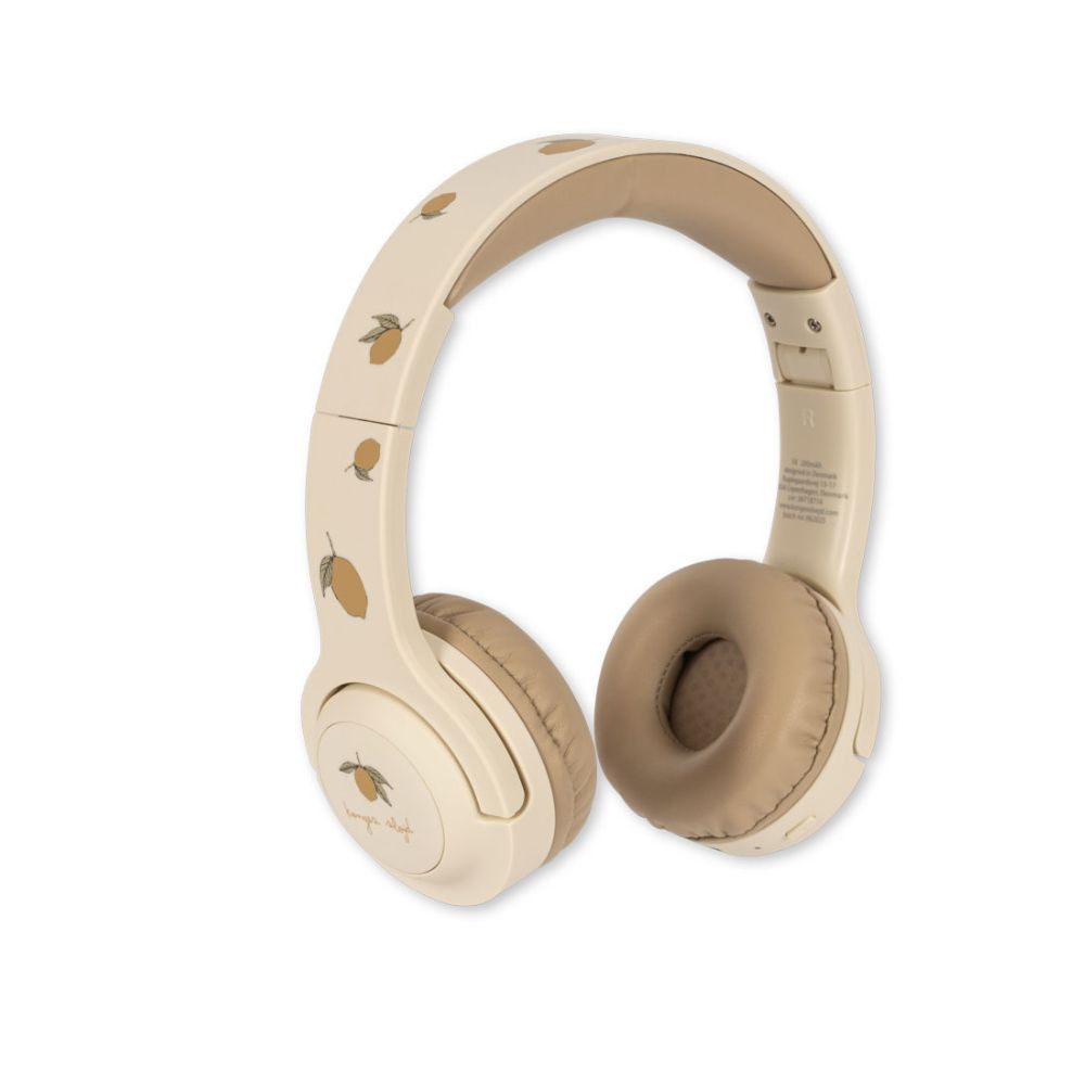 A Konges Sløjd vezeték nélküli gyerek fejhallgató egy stílusos és kényelmes kiegészítő, amelyet a márka ikonikus citrom és cseresznye mintái díszítenek.