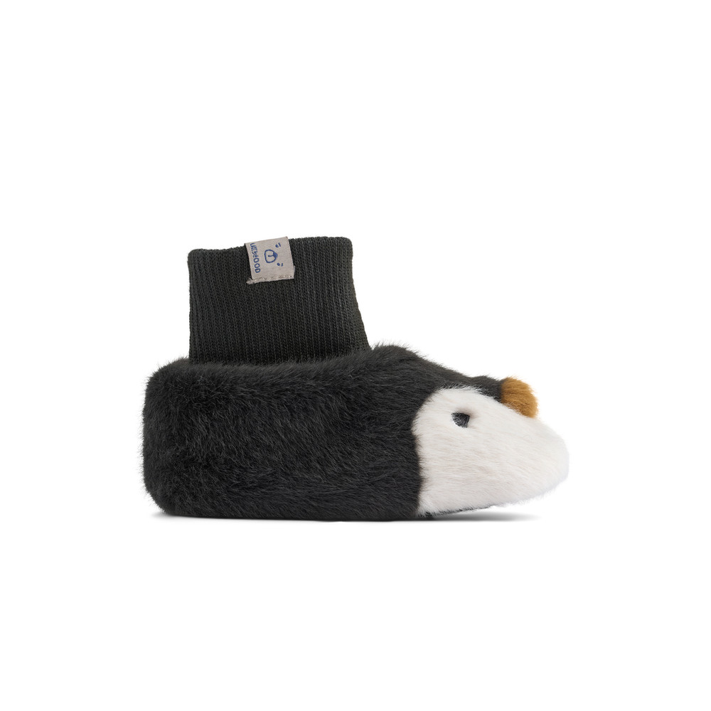A hajtogatható bordás szár gondoskodik róla, hogy a kiscipő a helyén maradjon, a talpon elhelyezett csúszásgátló pöttyök pedig extra biztonságot nyújtanak a járni tanuló apró lépésekhez. Puha plüss anyaga fenntartható és gyermekbarát választás, hiszen GRS-tanúsítvánnyal rendelkező, újrahasznosított poliészterből készült.