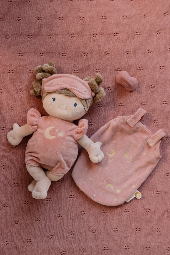 Rosa hálóruhában és hálózsákban érkezik, alvómaszkkal és cumival, amelyek segítenek megteremteni a lefekvés meghitt hangulatát. Különlegessége, hogy ruhája, hálózsákja és cumija sötétben foszforeszkál, így még varázslatosabbá teszi az esti pihenést. A baba ruhája levehető, így a gyerekek a gondoskodó szerepjáték örömét is átélhetik.