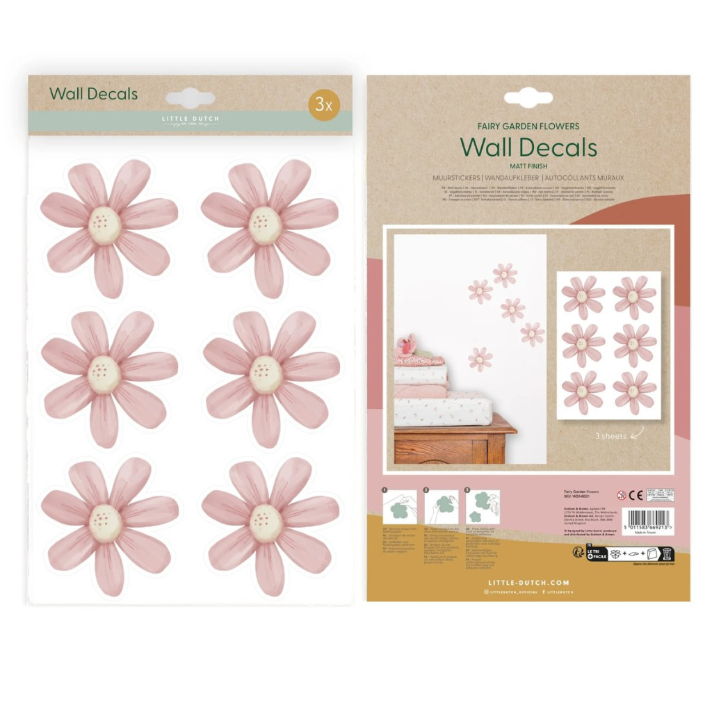 Varázsold a gyerekszobát egy színes virágmezővé a Little Dutch Fairy Garden virágos falmatricákkal!Ez a bájos szett 3 darab A4-es ívet tartalmaz, melyek vidám, színpompás virágokkal díszítik a falakat, ablakokat vagy bármely sima felületet.