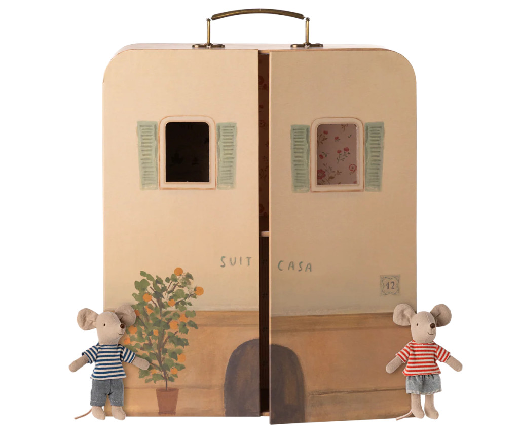 Üdvözlünk a SuitCasa-ban – egy különleges, hordozható kis egérházban, amelyet bárhová magaddal vihetsz! Ez a kreatív, bőrönd formájú házikó tökéletes méretű a Little Brother és Little Sister egérkék számára, így ideális választás a Maileg rajongóknak, akik útközben sem szeretnék nélkülözni kedvenc figuráikat.