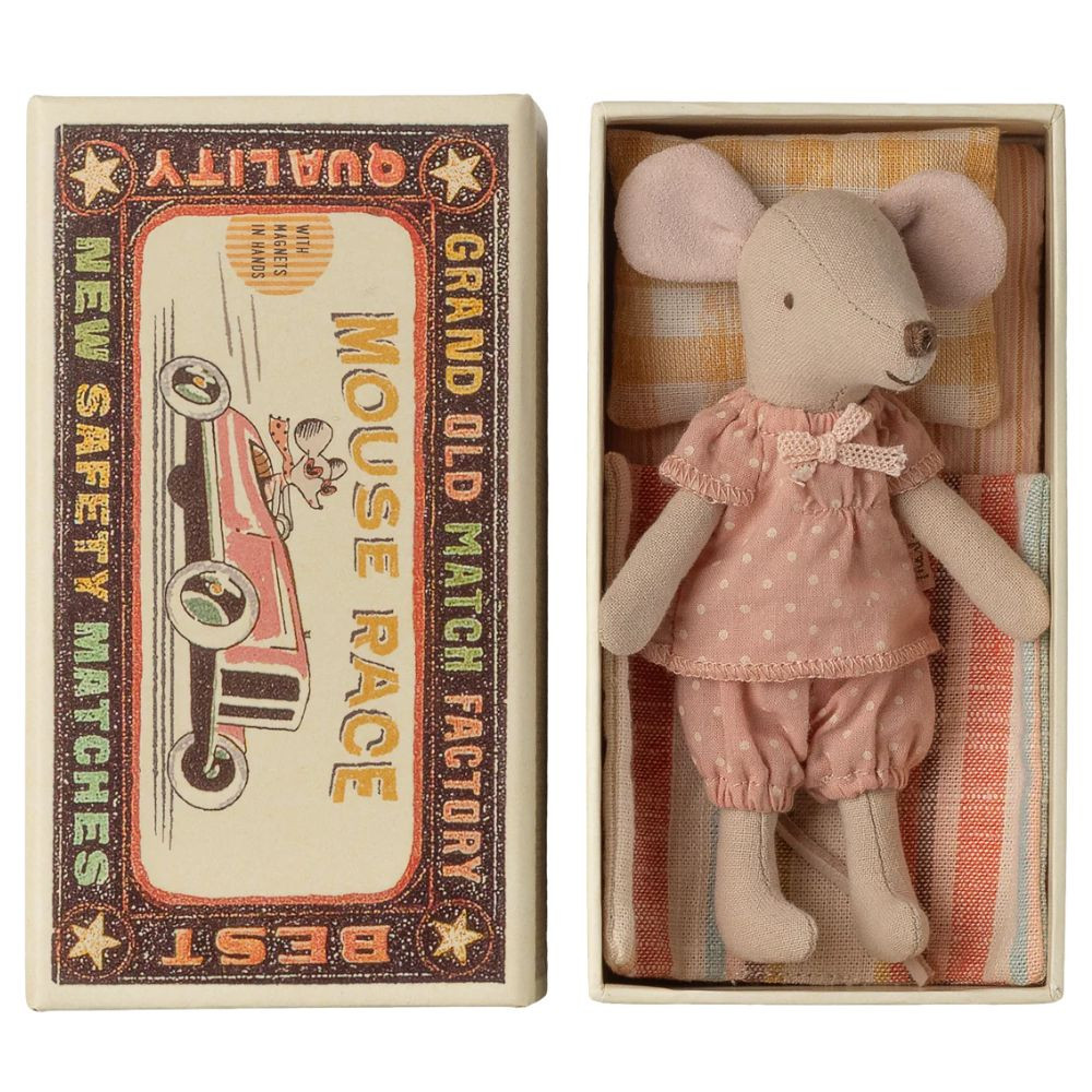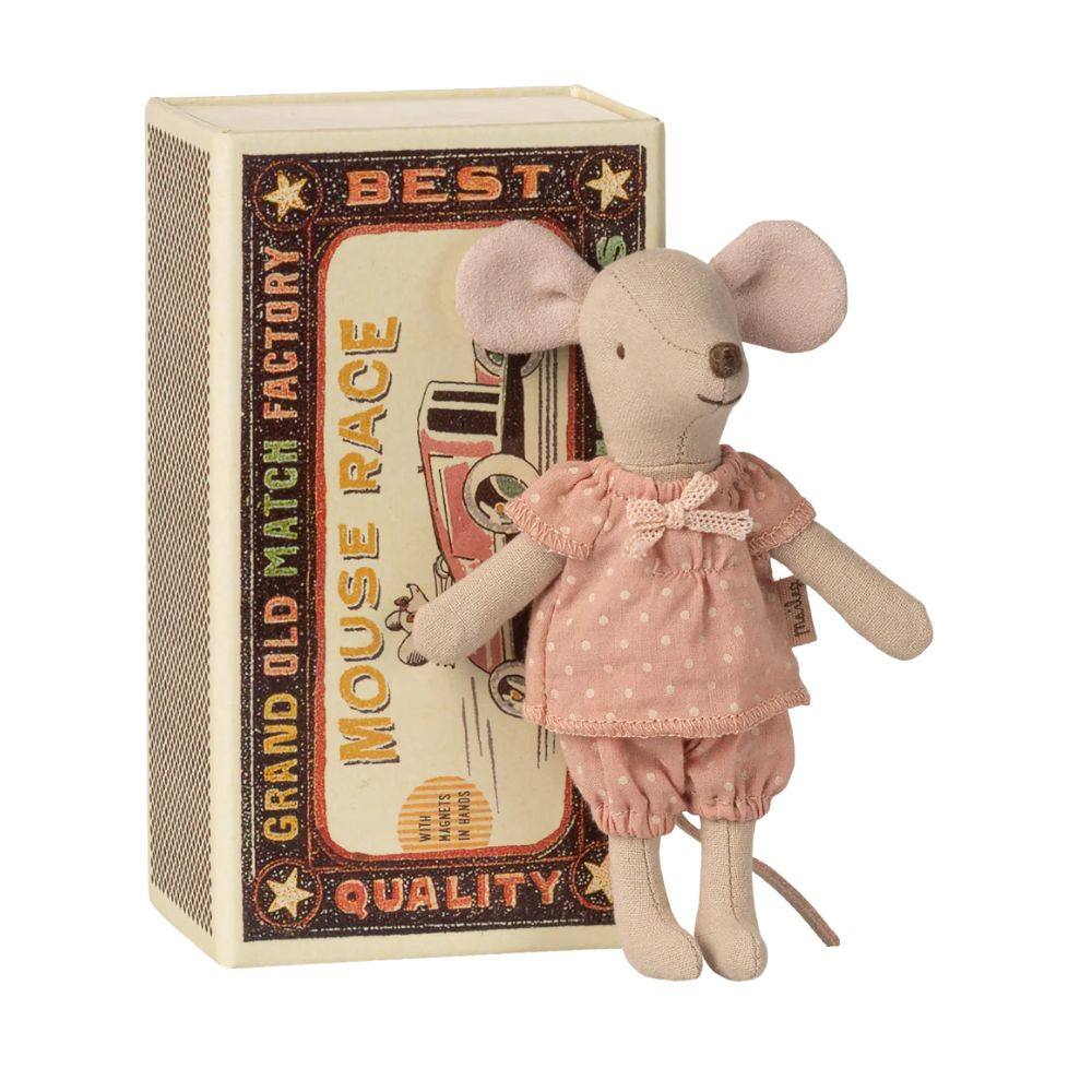 Igazi klasszikus Maileg darab, amely generációk kedvence lehet. Ez a bájos egérfigura hosszú órákon át tartó játékra kész, majd a nap végén kényelmesen pihen meg saját, apró gyufásdoboz ágyikójában. Ruhája és ágyneműje puha anyagból készült, egyedi mintákkal és gyönyörű színekkel, amelyek még különlegesebbé teszik ezt a szerethető figurát. Az egér kezeiben mágnes található, így még több kreatív játéklehetőséget kínál. Méret: Magasság: 13 cm Anyag: pamut / karton Töltet: újrahasznosított poliészter / PE pellet Ajánlott életkor: 3 éves kortól Tökéletes ajándék és örökzöld választás minden Maileg rajongónak, amely a képzeletbeli történetek központi szereplője lehet. Miért népszerűek a Maileg játékok? A Maileg játékok a részletgazdag kidolgozásuk és egyedi, bájos stílusuk miatt rendkívül népszerűek. Minden Maileg figura és kiegészítő gondosan megtervezett, hogy ösztönözze a kreatív szerepjátékot, miközben varázslatos világot nyit meg a gyerekek előtt. Emellett a kiváló minőségű anyagok és a fenntartható gyártás is hozzájárulnak a Maileg termékek tartósságához és népszerűségéhez, így nemcsak a gyerekek, hanem a szülők körében is kedvelt választás.