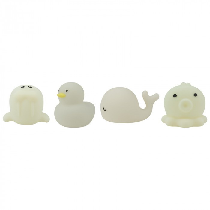 Fedezd fel a világító tengerlakók varázsát! A MARY'S Tengeri állatos világítós fürdőjátékok egy elbűvölő, négy darabos LED lámpa szett, melyben egy kis kacsa, egy bálna, egy rozmár és egy polip világítja meg a fürdőt vagy a gyerekszobát színváltós, meleg fénnyel.