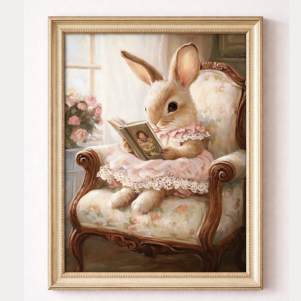 Ez a bájos, festményszerű stílusban készült poszter egy könyvébe mélyedő nyuszi kislányt ábrázol, aki egy vintage hangulatú fotelben ülve fedezi fel a mesék világát. A lágy pasztellszínek, a finom részletek és a romantikus hangulat különösen meghitté teszik ezt az illusztrációt.