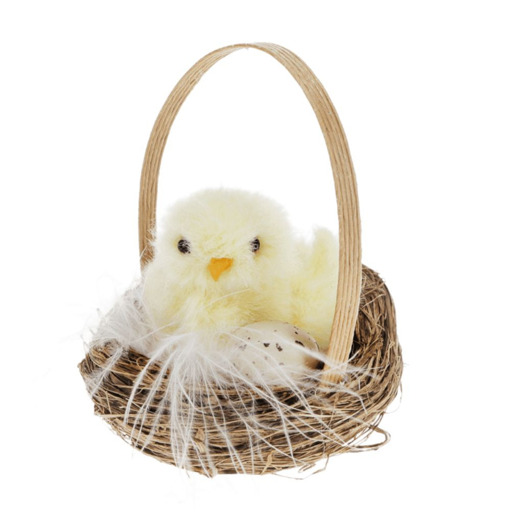 Bájos húsvéti dekoráció, amely egy pihe-puha, sárga csibét ábrázol egy kosárban ülve, mellette egy tojással.