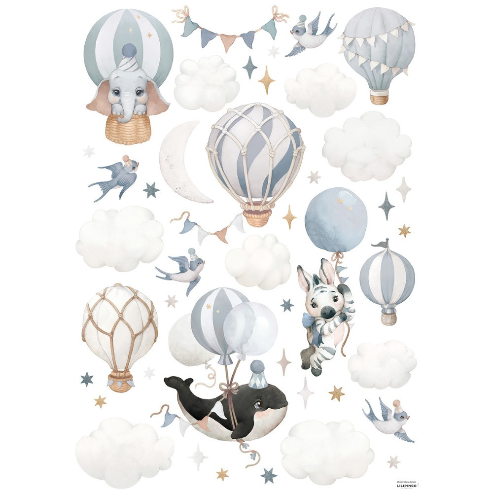 Tedd harmonikussá a gyerekbirodalmat ezekkel a prémium minőségű állatos kék hőlégballon falmatricákkal a francia Lilipinso márkától!