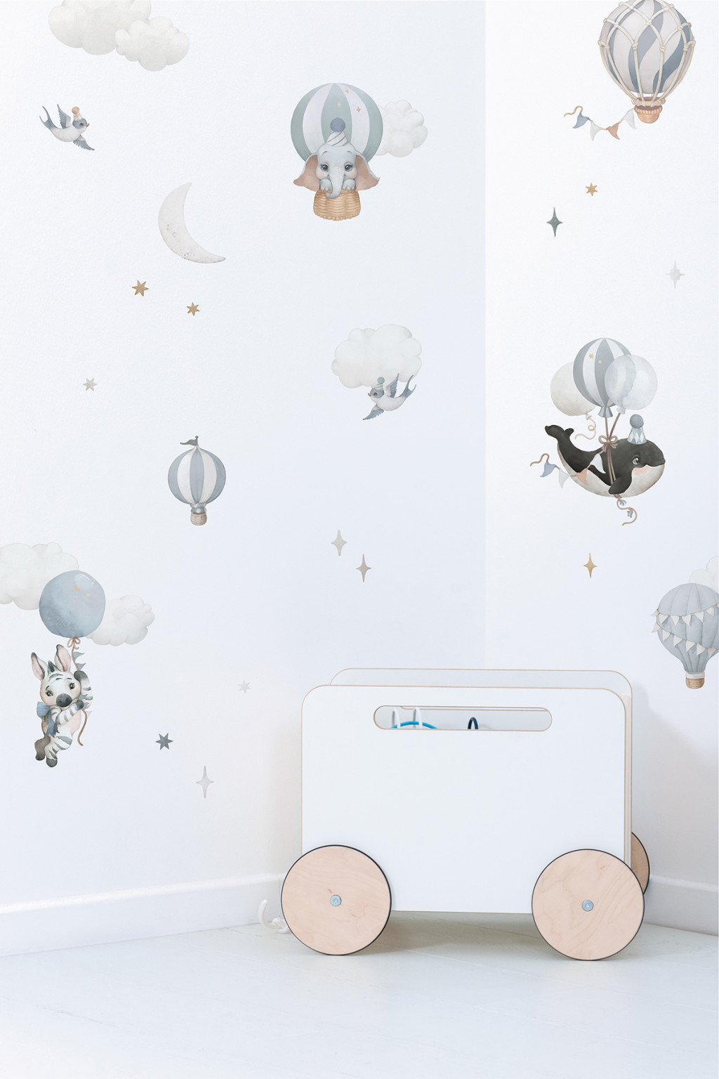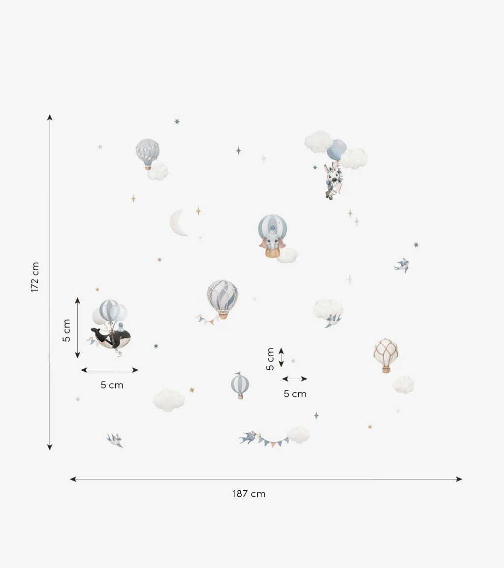 Ez a 64 x 90 cm méretű falmatrica lap hőlégballonokat, léggömböket, felhőket, csillagokat és kék árnyalatú állatokat ábrázol. Tökéletes választás, hogy a gyerekszobát varázslatos és álomszerű hangulattal töltsd meg.