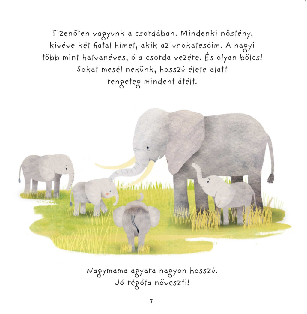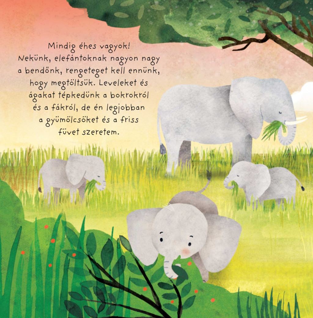 Óvodásoknak szóló mese és ismeretterjesztő, kézműveskedéssel és kvízzel. Kiselefánt bemutatja a csordáját, amit a nagymajája vezet, és elmeséli, hogyan telik egy napjuk. Hány tagú és kikből áll az elefántcsorda? Mit esznek az elefántok? Hogyan isznak és hogyan érnek fel a fák tetejéig? Mennyit kell gyalogolniuk az élelemért? És hogyhogy nem marad le a nagyok mögött a kiselefánt? Mire való az ormány és az agyar? Miért jó a sárfürdő? Hogyan védekezik a csorda a támadókkal szemben? Hogyan beszélgetnek az elefántok? Ha pedig a mese végére értél, lapozz tovább az elefántinfóra, még több ismeretért, a leírást követve barkácsolj mozgatható orrú, papírelefántot, és válaszolj a kívzkérdésekre!