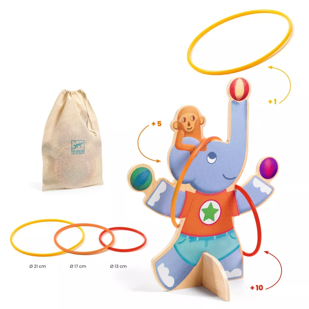 A játék célja, hogy kiderüljön, ki a legügyesebb célzó és dobó. Ki szerzi a legtöbb pontot a versenyben az elefánt megcélzásával? A karikákért járó pontok száma a méretüktől függ, de vigyázat, minél kisebbek a karikákk, annál nehezebb őket pontosan dobni! Játékváltozat: minél távolabb határoznak meg a játékosok egy dobózónát, annál nehezebb pontot szerezni.
