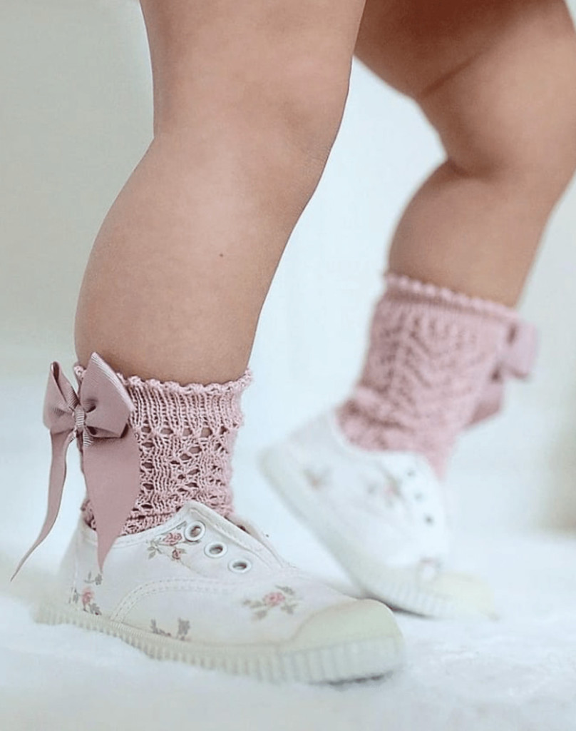 A tavaszi viselet elengedhetetlen kelléke ez a gyönyörű gyöngymintás pamut rövid zokni bájos masnival.