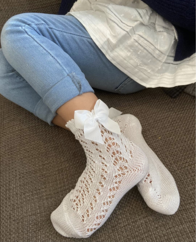 A tavaszi viselet elengedhetetlen kelléke ez a gyönyörű gyöngymintás pamut rövid zokni bájos masnival.