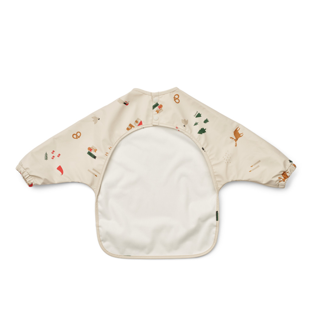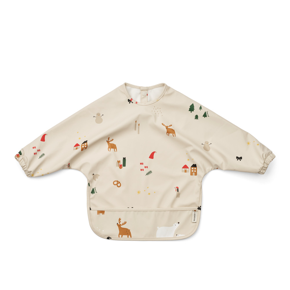 Praktikus hosszú ujjú előke ünnepi mintákkal a Liewood-tól, az egyszerű és örömteli étkezésért.