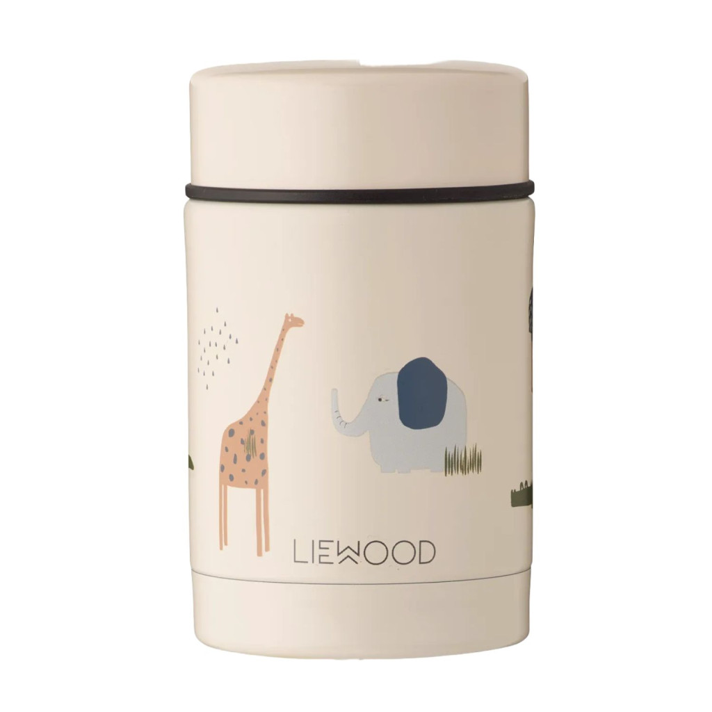 Stílusos ételtároló nem csak gyerekeknek a dán Liewood márkától.Szafari állatos mintával ellátott ételtároló, amely ideális bármely olyan esetben, amikor hosszabb időre el kell menni otthonról, az elkészített ételt pedig kényelmesen magunkkal vihetjük.Szilikon gyűrűvel ellátott duplafalú rozsdamentes acél hőtárolós ital- és ételtároló, jól zárható csavarós kupakkal. Végre egy ételtartó, ami valóban nem folyik ki, nem csöpög, tartja a hideget és a meleget egyaránt és jól is néz ki!Teszteltük és bevált! Gyermekeknek, felnőtteknek egyaránt jól használható.Folyékony és szilárd ételnek italnak is megfelelő: levesek, főételek, italok, és turmixitalok egyaránt tehetők bele, ételhordó és italtároló egyben.Nem veszi át az étel és ital ízét.A termék további jellemzői: