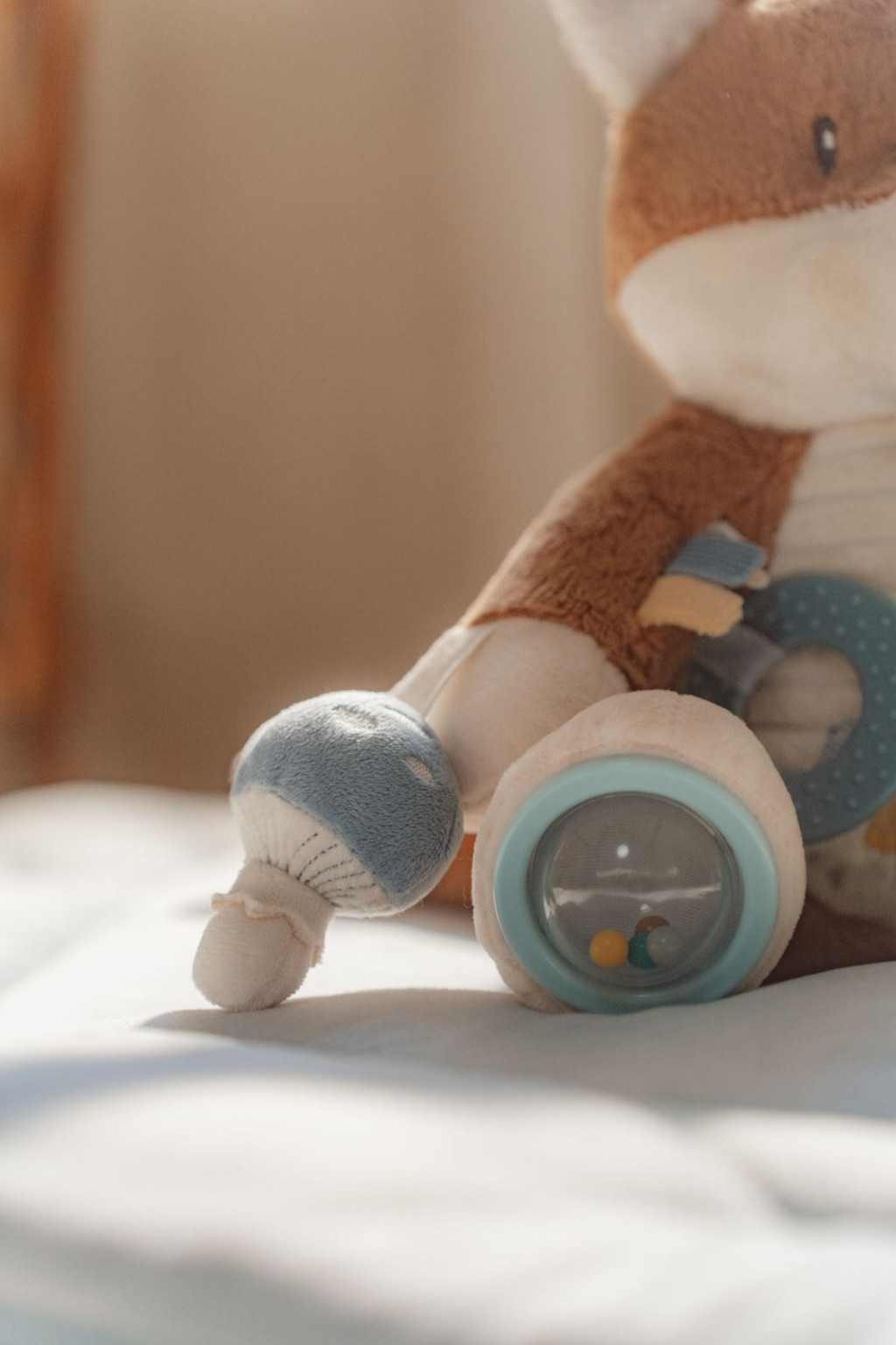 Ez a bájos activity plüss róka nemcsak ölelést ígér, hanem számos izgalmas tevékenységet is rejt magában. Fedezd fel az összes szórakoztató elemet, amit ez a róka kínál: egy zizegő bogár a vállán, csörgő hangok, és tapintható címkék, makk és gomba várnak a felfedezésre. A lábán lévő karikák és az egyik talpán található tükör számtalan érdekességet tartogat, hogy felkeltse a kicsik kíváncsiságát.