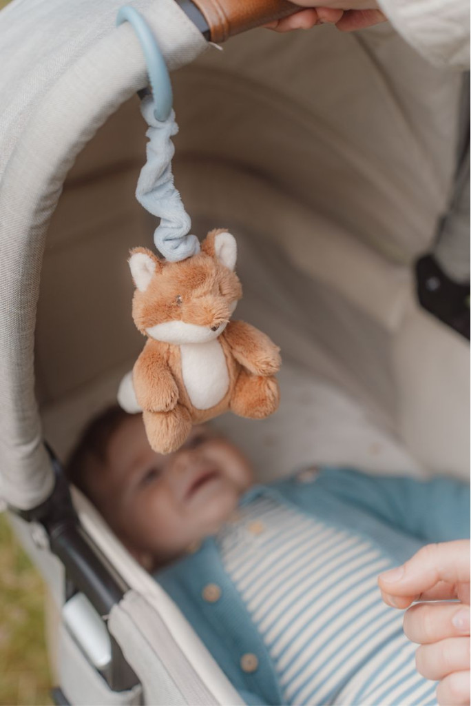 Puha rezgő plüss bébi róka lehet kisbabád első kedvenc játéka, amely hordozóra, kiságyra, járókára vagy akár babakocsira is akasztható. A zsineg meghúzását követően a kis őzike rezegni kezd. Ez a húzó-rezgő játék sokáig megunhatatlan játék a kicsik számára. A gyűrűnek köszönhetően a róka könnyen rögzíthető a járóka, az autóülés vagy a babakocsi tolókarjára.Jellemzők: