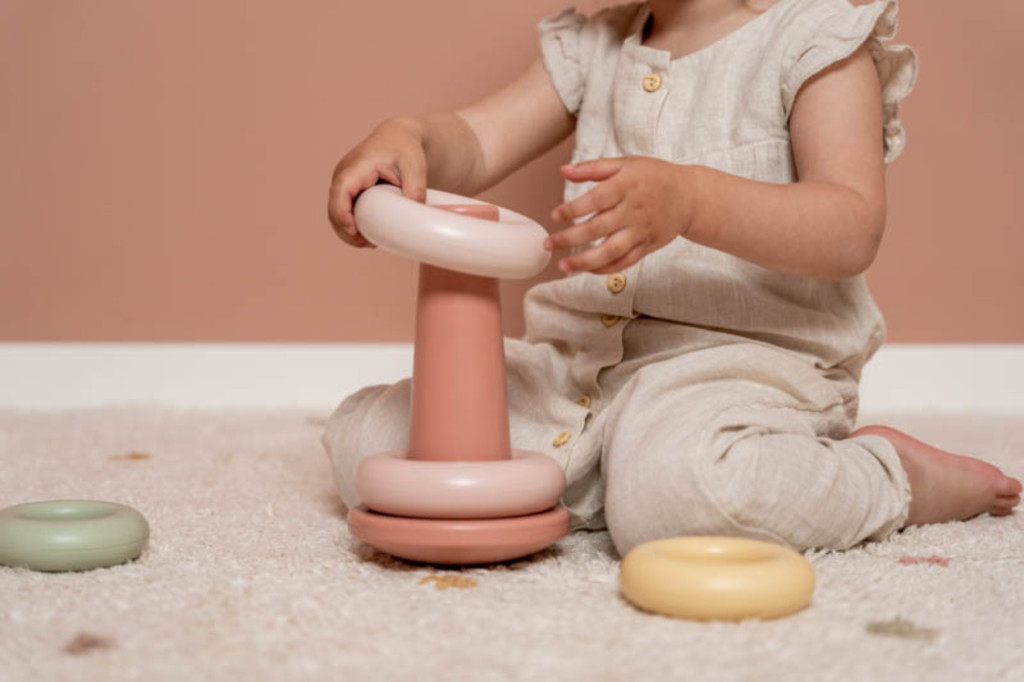 A jól ismert montessori tornyot káprázatos színekben és BPA mentes polipropilén műanyagból is elkészítette a Little Dutch, így könnyebb a fogása a kisebb babák számára is, ha még a teljes torony építése nem megy, akkor is elkezdhet ismerkedni a színekkel és formákkal a gyűrűk által.
