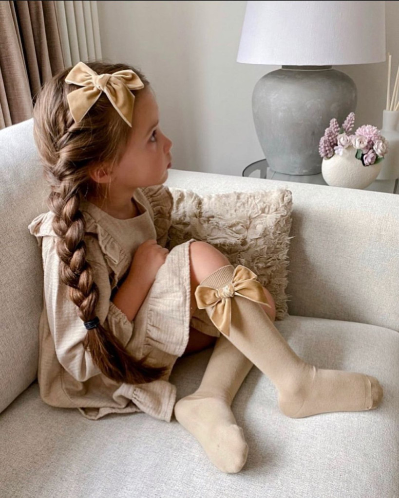 A tavaszi viselet elengedhetetlen kelléke ez a divatos magasszárú zokni, bájos bársony masnival díszítve.