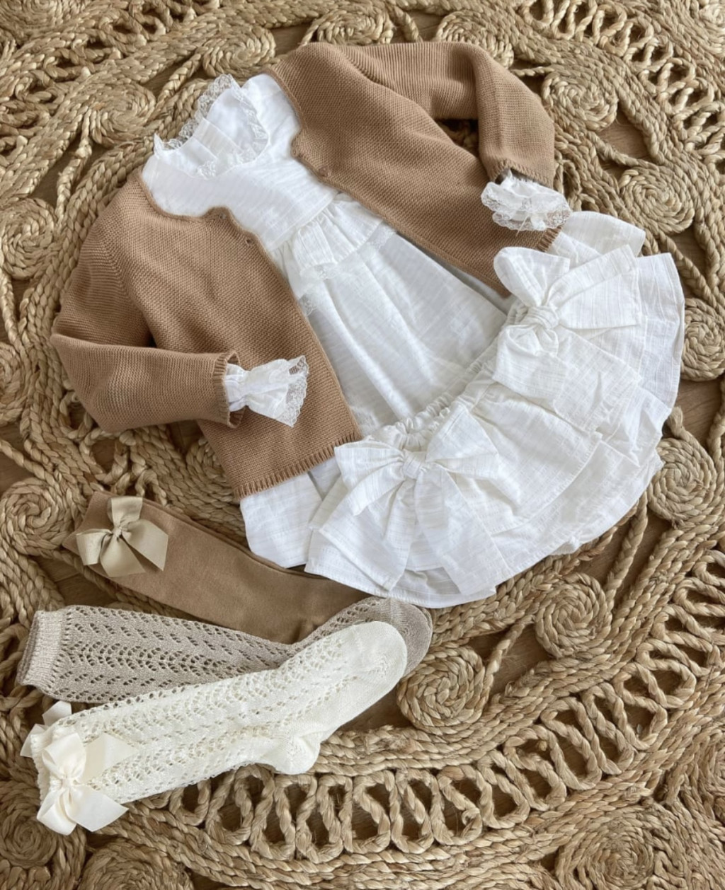 A tavaszi viselet elengedhetetlen kelléke ez a divatos magasszárú zokni, bájos masnival díszítve.