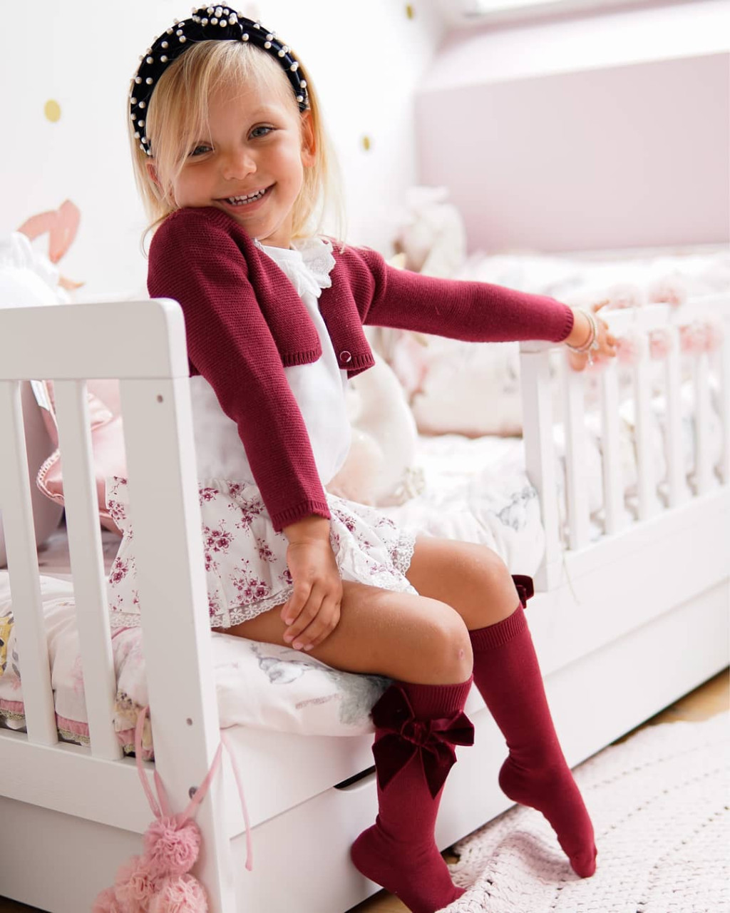 A tavaszi viselet elengedhetetlen kelléke ez a divatos magasszárú zokni, bájos bársony masnival díszítve.