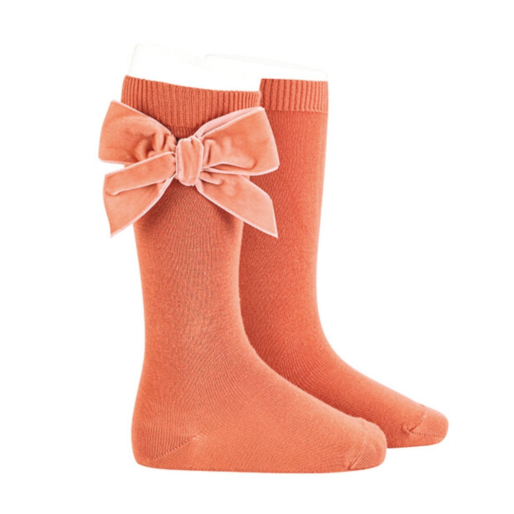Magasszárú zokni bársony masnival - őszibarack - 3-6 hó