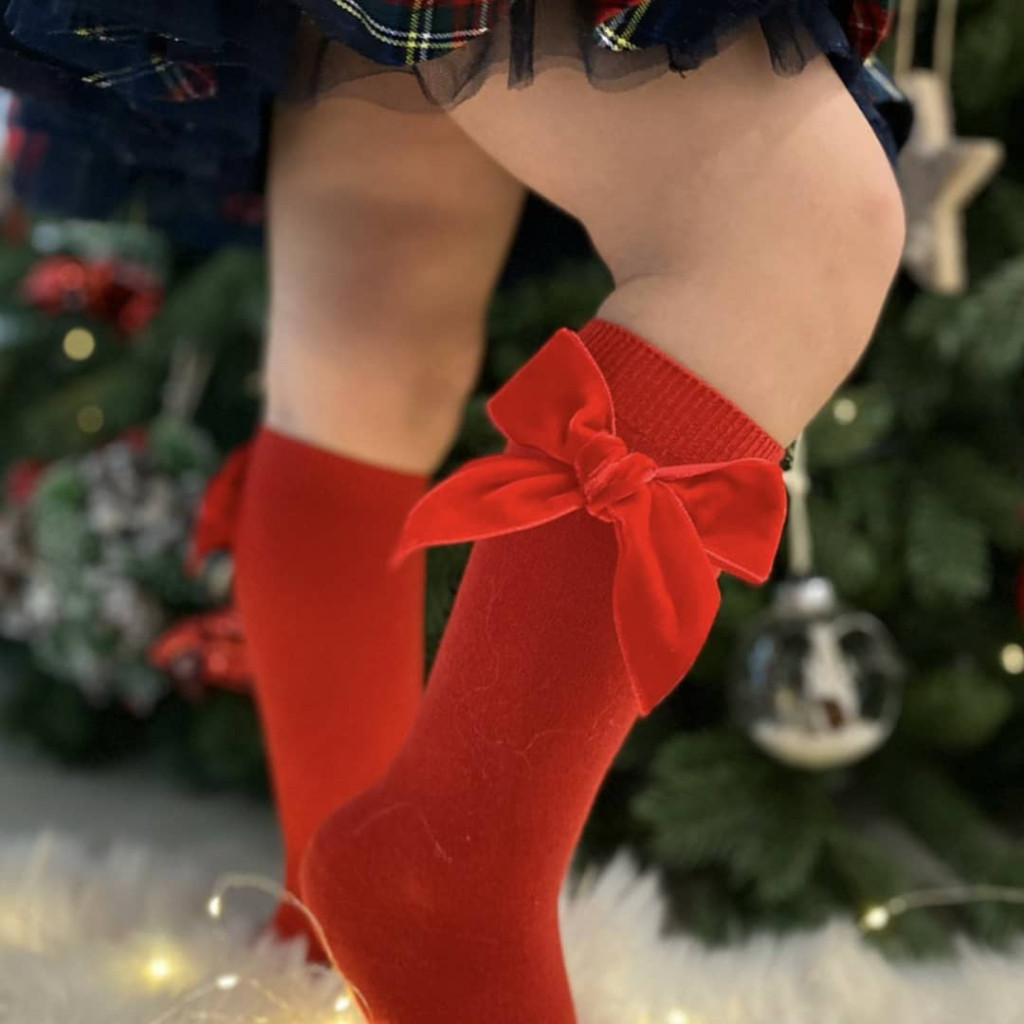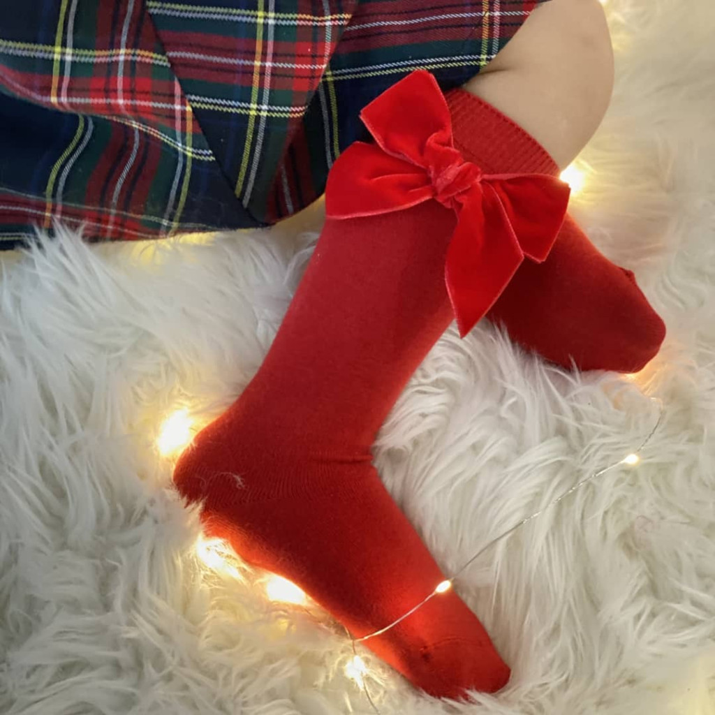 A tavaszi viselet elengedhetetlen kelléke ez a divatos magasszárú zokni, bájos bársony masnival díszítve.