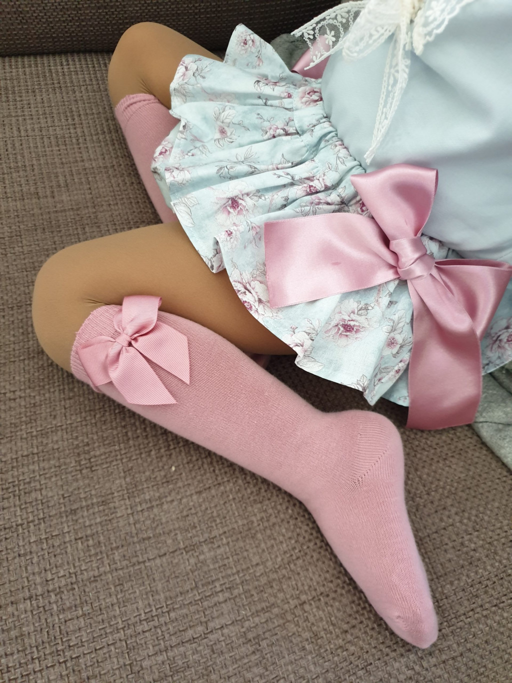 A tavaszi viselet elengedhetetlen kelléke ez a divatos magasszárú zokni, bájos masnival díszítve.