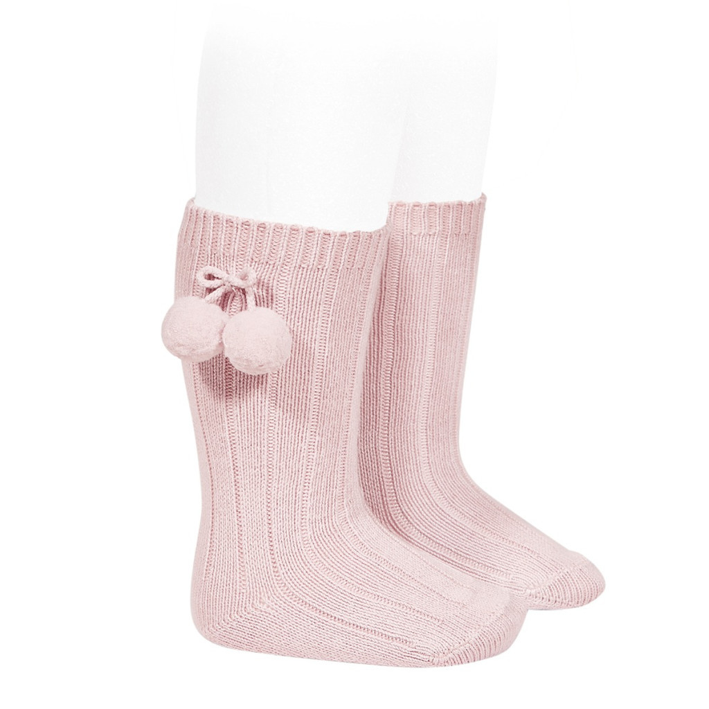 Divatos magasszárú bordázott zokni, meleg pamutból és puha pom pommal díszítve.