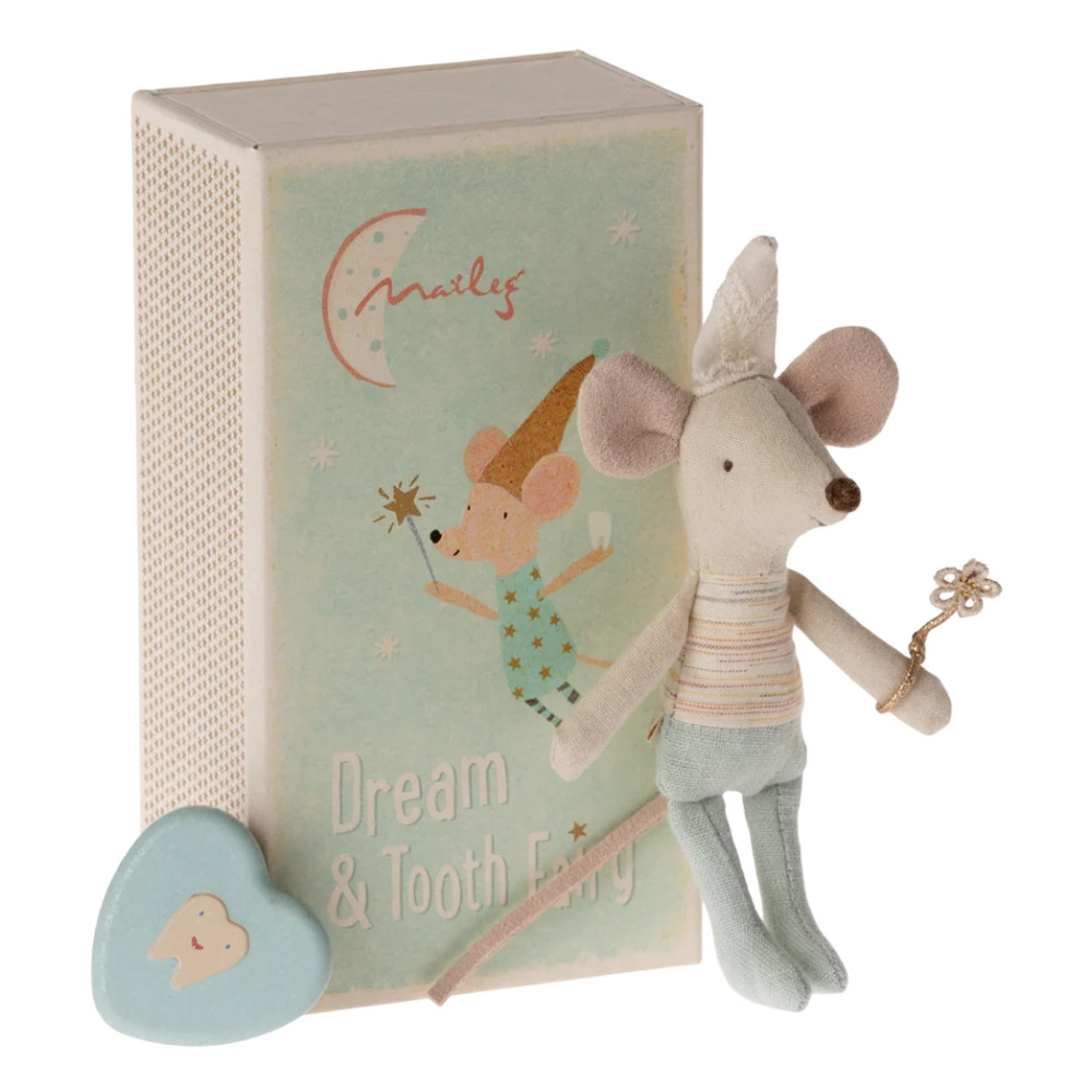 Ez a bájos fogtündér egér varázslatos ruhába öltözött, és egy puha ágyneművel bélelt ágyikóban pihen. A szett tartalmaz egy fogtartó dobozkát és egy gyufásdobozt, amely az egérke otthonául szolgál. A ruhák anyaga változhat, így minden darab egyedi.