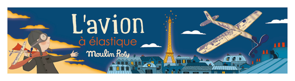 Balsafából készült felhúzható repülőgép kék színben, propellerrel és elasztikus meghajtással. Az illusztráció "Párizs éjszakai felfedezése" tematikája köré lett tervezve.