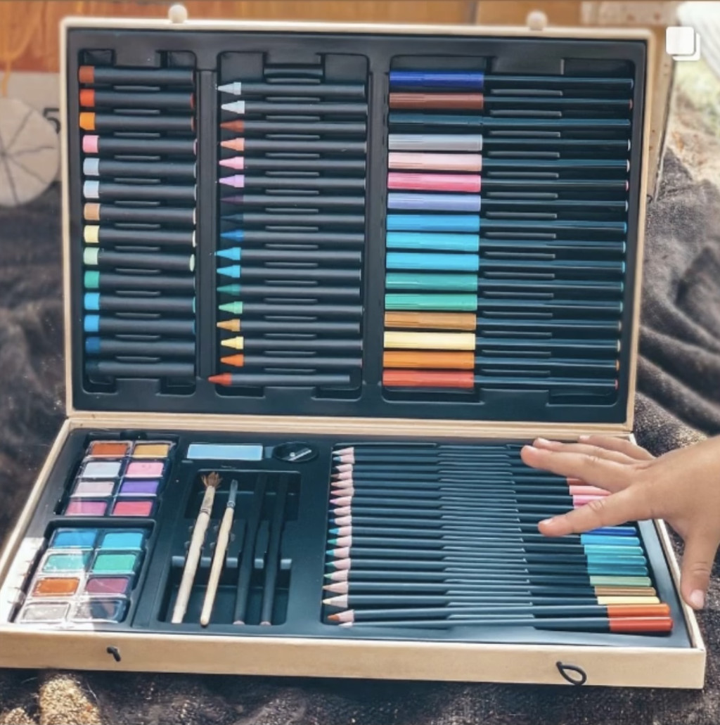 A díszdoboz tartalma: színes ceruzák, zsírkréták, pasztell kréták, festékek, ecsetek, hegyező és radír.