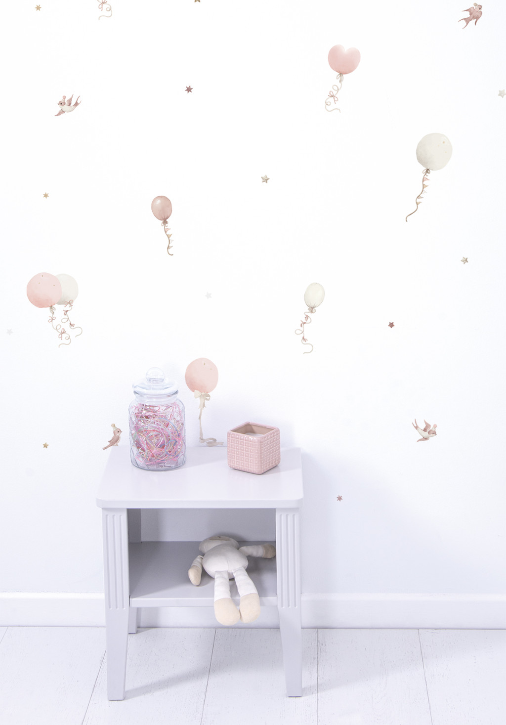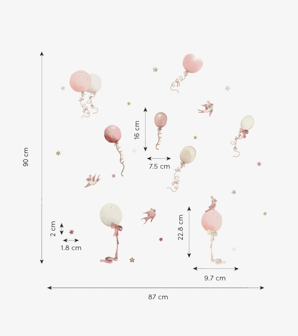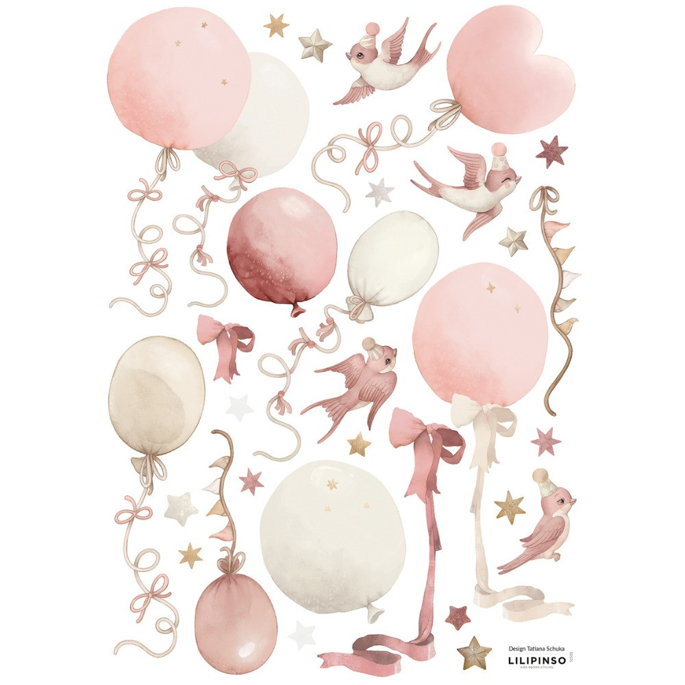 Ez a 29,7 x 42 cm-es falmatrica lap, amely rózsaszín árnyalatú léggömböket, csillagokat és madarakat tartalmaz. Tökéletes kiegészítője a gyerekszoba dekorációjának, vidám és nyugodt hangulatot teremtve.