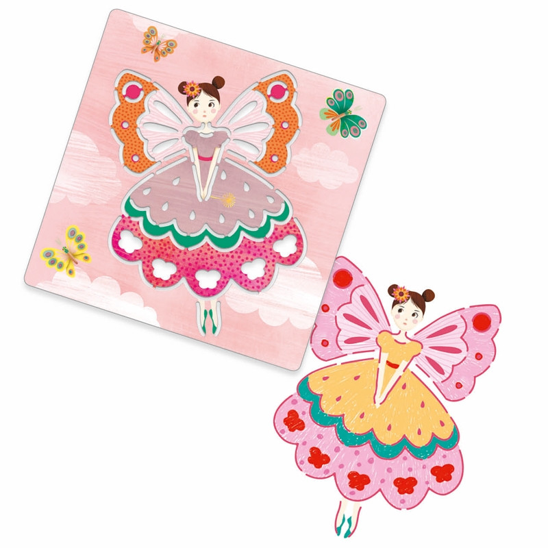 Tündérek, 5 db-os kreatív rajzkészlet, rajzsablon a Djeco-tól, melyek kiváló minőségűek, enyhén rugalmasak, így könnyedén moshatóak.