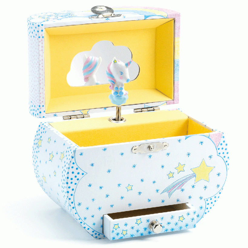 A Djeco zenélő ékszertartójának a főszereplője egy unikornis, ami a doboz felnyitásakor egy dallamot játszik le.